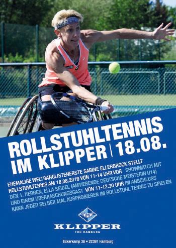 Ihre „Gegner“, neben Carina Witthöft beinahe die gesamte 1. Herren des Klipper THC und die Nr. 1 der Damen, Ella Seidel, wussten manchmal nicht, wie ihnen geschah. Aufschläge, Vor-und Rückhände und besonders das schnelle Drehen des Rollstuhls und die Geschwindigkeit, mit der Sabine diesen über den Platz bewegte, ließen die Zuschauer staunen.